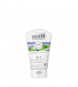 Lavera гел, пилинг и маска 3 в1 – активно се бори със замърсяванията и предотвратява повторната им поява. Активните съставки био мента и силициева глина почистват кожата в дъбочина, предотвратяват появата на бъдещи раздразнения и регулират отделянето на себум. Натуралната салицилова киселина, извлечена от кора на върба, активно се бори с акнето.