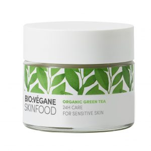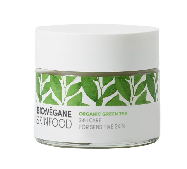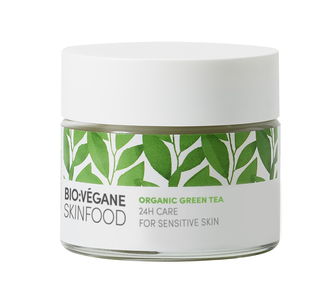 Интензивно защитаващият BIO:VÉGANE БИО ЗЕЛЕН ЧАЙ 24-часов крем с екстракт от суперхраната – био зелен чай, екстракт от корена на био женско биле, екстракт от листата на био гинко и био масло от маслина, успокоява раздразненията, връща естествения баланс на кожата и я изглажда. Минимизира леките раздразнения и зачервявания, подхранва лющещите се от сухота зони и предпазва от загуба на хидратация. Укрепва естествените защитни функции на кожата и я защитава от вредните околни влияния.