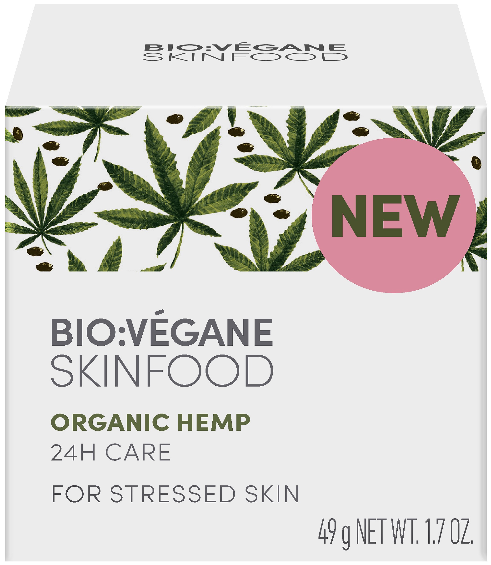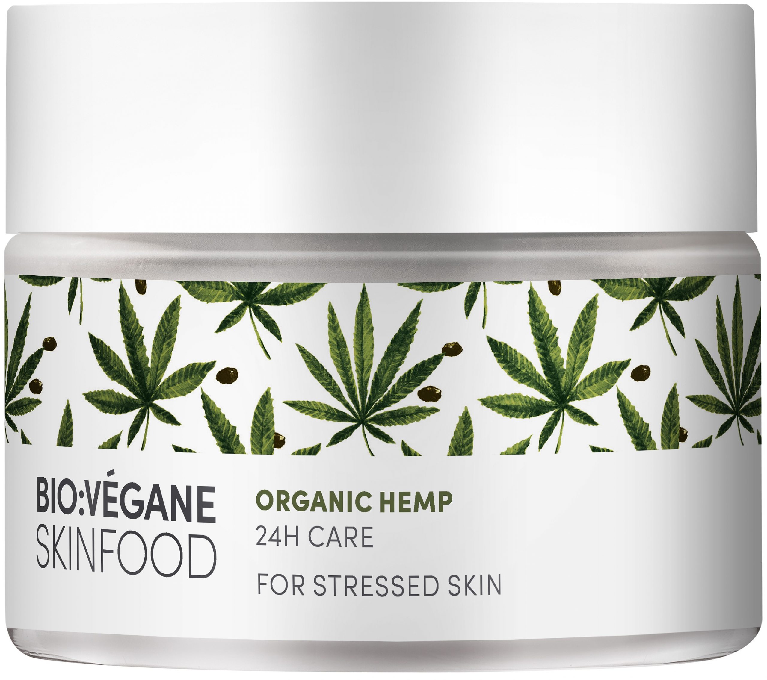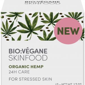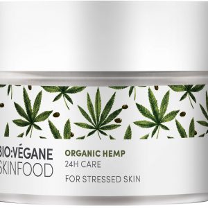 BIO:VÉGANE БИО КОНОП 24-часова грижа с екстракт от суперхраната – био масло от конопено семе, богато на омега мастни киселини и предпазва всички типове кожа от „кожен стрес“, който може да възникне от вредните влияния на околната среда и при липса на хидратация. Оптимизира съдържанието на вода в кожата и успокоява раздразнената кожа. Леките масла от бадем и жожоба подобряват еластичността на кожата, без да я омазняват. За приятно усещане за спокойна кожа.