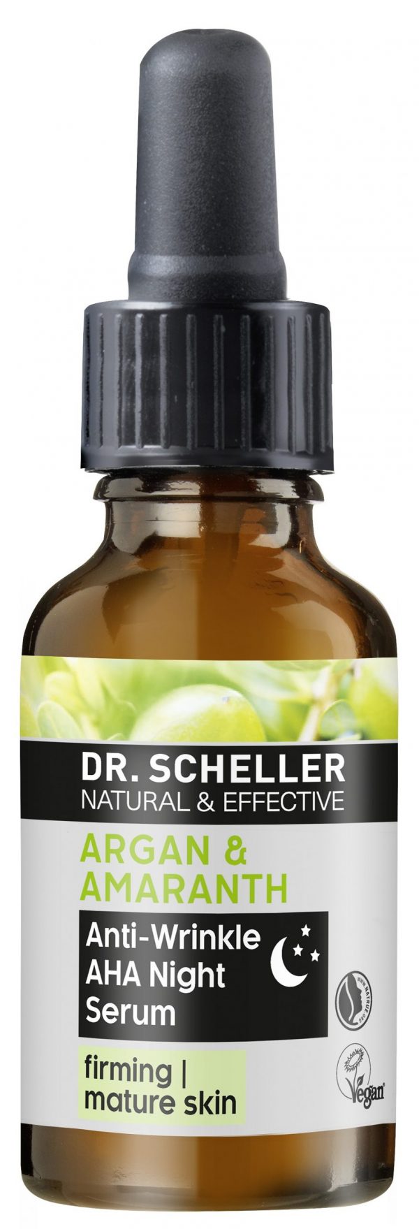 Нощният серум против бръчки с AHA киселини (плодови киселини) и с възстановяваща комбинация от екстракти от семена от арган, семена от амарант и корен от женско биле отстранява мъртвите клетки, изглажда зрялага кожа и стимулира естествения процес на възстановяване на клетките
